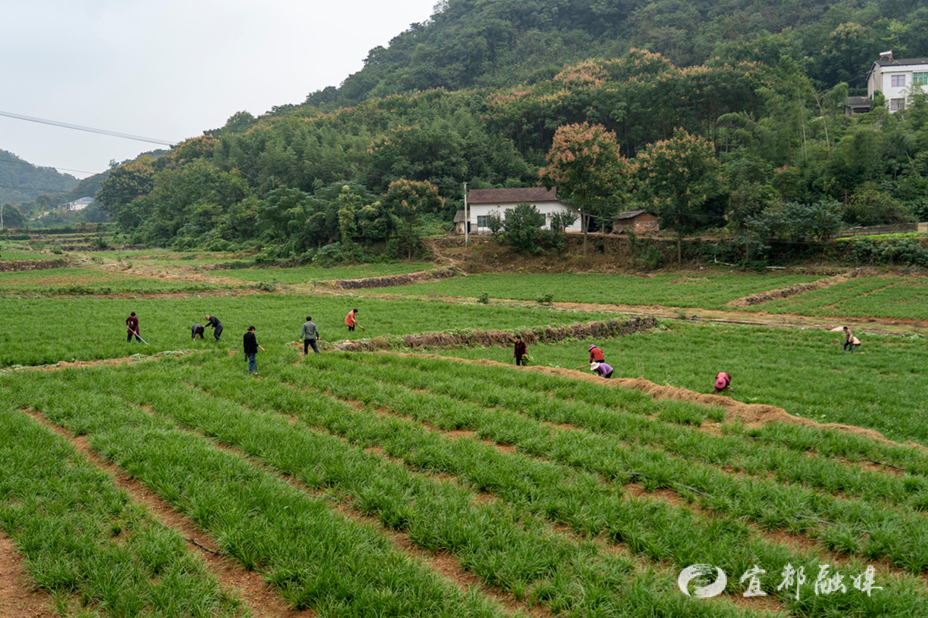 10月12日,在枝城鎮(zhèn)鐘家沖村麥冬基地,村民們?cè)邴湺乩锍荨?/p> 2025-10-13